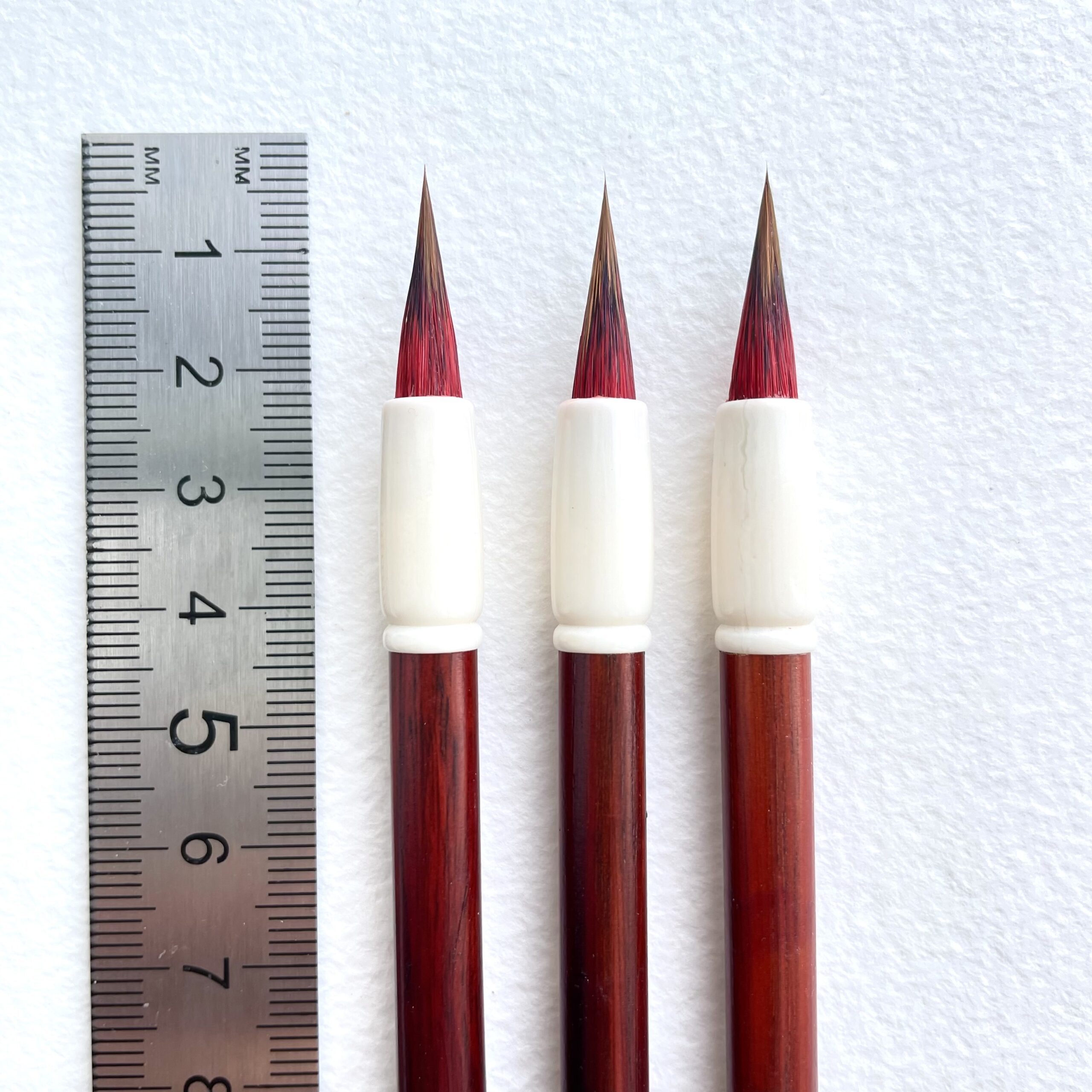 Cabeça do pincel formada com pelo sintético de aquarela no centro, com pelo natural de lobo vermelho por fora.